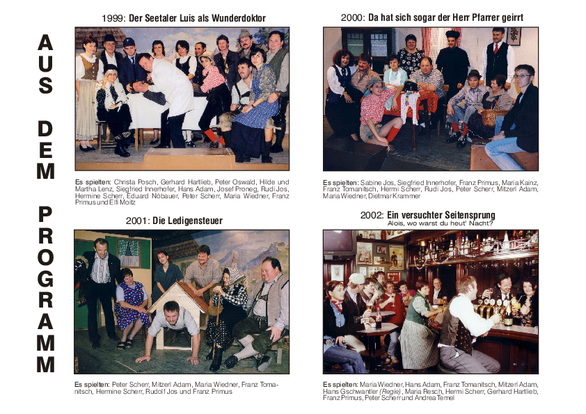Das Stück: „Der Seetaler Luis als Wunderdoktor“ war dann die Geburtsstunde des heutigen Theatervereins, der jährlich einmal mit einem lustigen, doch immer recht anspruchsvollen Stück, die Lachmuskeln der zahlreichen Besucher strapaziert. Dabei kommt es der Vereinsführung besonders darauf an, keinesfalls mit derben Späßen seichte Unterhaltung zu bieten. Deshalb stehen die Aufführungen durchwegs auf hö-herem Niveau. Außerdem kommt es immer wieder vor, dass nach Art eines Kabaretts zeitkritisches oder tagespolitisch aktuelles Geschehen mit verarbeitet wird.
